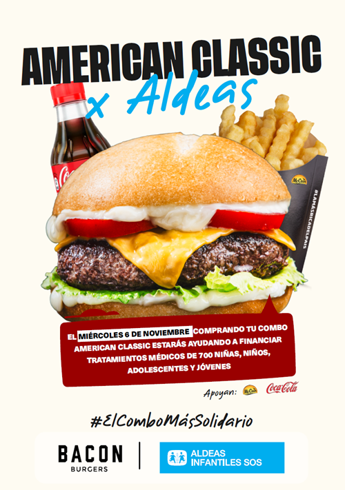 American Classic x Aldeas de Bacon Burgers será el miércoles 6 de noviembre, día en el cual un porcentaje de todas las ventas del combo American Classic (hamburguesas, papas y gaseosa) será destinado a financiar tratamientos médicos que necesitan los 700 niñas, niños, jóvenes y adolescentes beneficiados con los programas sociales de Aldeas Infantiles SOS Paraguay.
